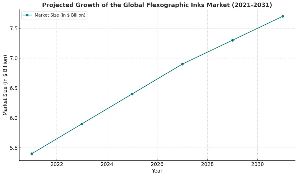 The global flexographic inks market was valued at approximately $5.4 billion in 2021 and is projected to grow at a 4% CAGR, reaching around $7.7 billion by 2031. The expansion is primarily fueled by:
